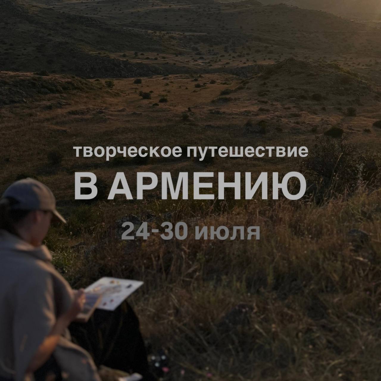 Творческое путешествие в Армению: пленэр, вдохновение и отдых для души Даты: 24-30 июля Группа: 12 человек Представьте: утренний воздух, наполненный ароматом горных трав. Вы сидите на холме с холстом перед глазами, а перед вами — потрясающий пейзаж, который хочется запечатлеть навсегда. В этом путешествии мы будем не только изучать Армению, но и создавать свои картины, вдохновляясь ее красотой. Что вас ждет? Живопись на пленэре – рисование на природе в окружении величественных гор Экскурсии по Армении – древние монастыри, винодельни, водопады и захватывающие пейзажи Творческая атмосфера – группа единомышленников, вдохновение и поддержка Перезагрузка и отдых – гармония, неспешный ритм и свобода для творчества Все трансферы по программе Мастер-классы по живописи и пленэры Все расходные материалы (холсты, краски, кисти и т. д.) Экскурсии по ключевым достопримечательностям Дополнительно оплачивается: Авиабилеты до Еревана и обратно Туристическая страховка Личные расходы (сувениры, дополнительные развлечения) Для бронирования места в группе необходимо внести предоплату. Мест всего 12! Оставьте заявку сейчас и проведите лето незабываемо!